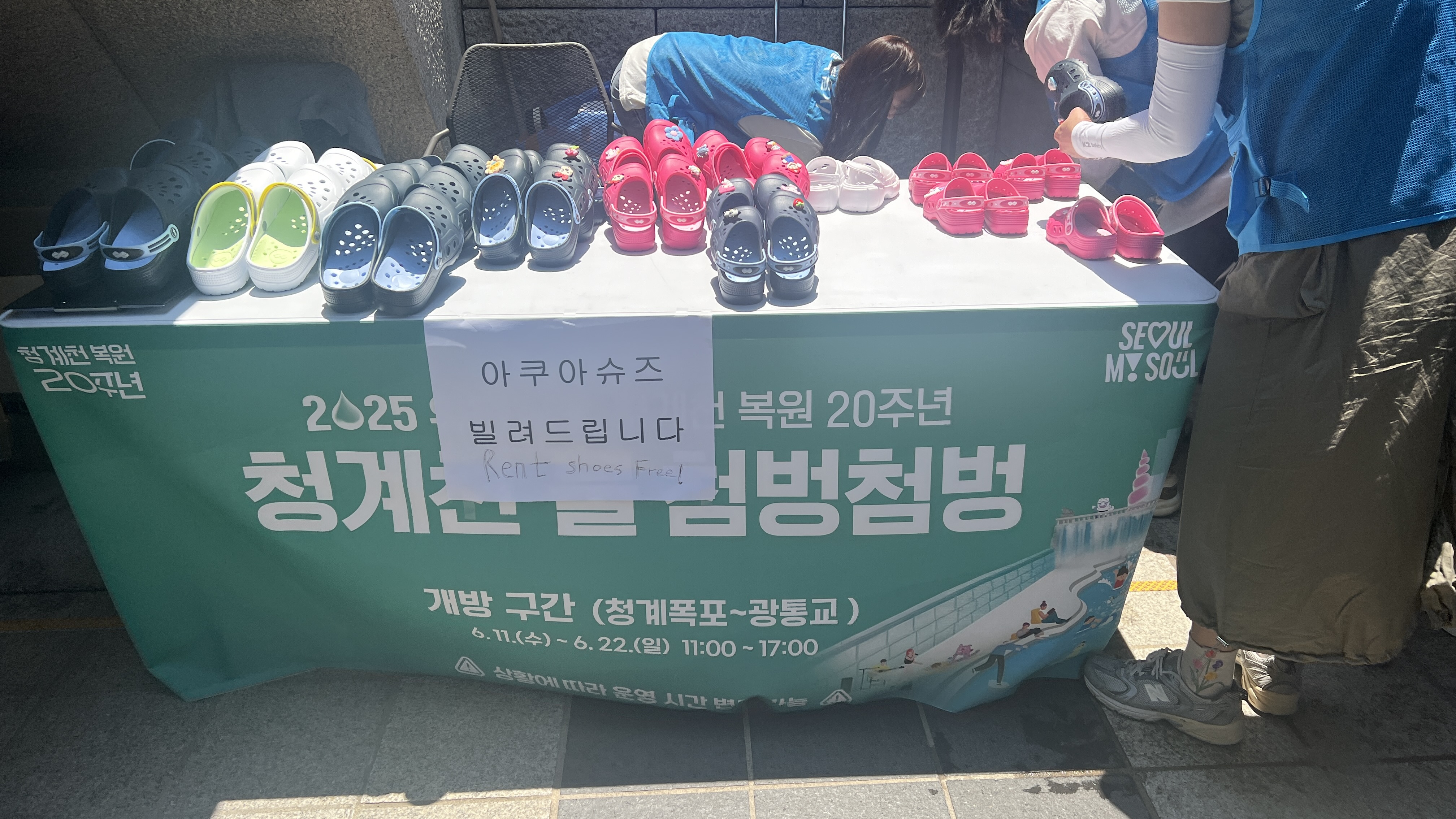 현장에서 신발을 벗고 청계천 물에 발을 담그는 체험이 가능해요.