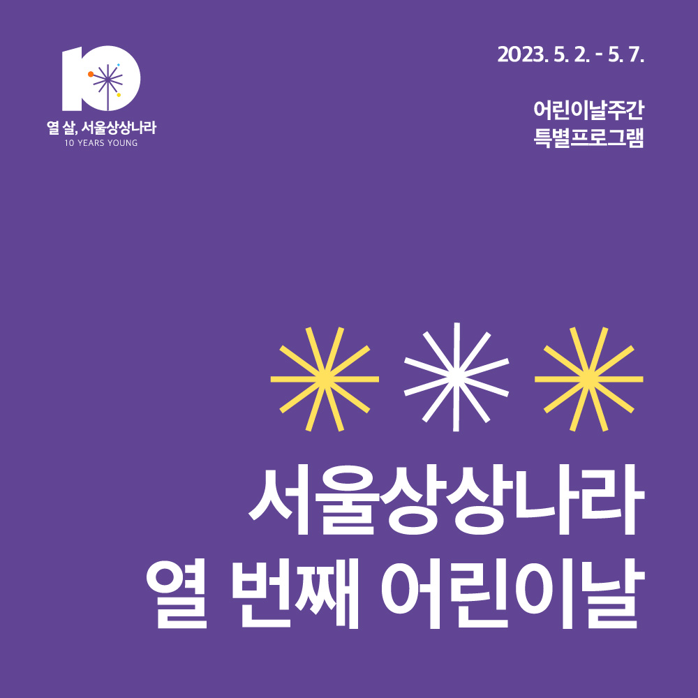서울 상상나라는 개관 10주년을 기념하여 행사와 체험활동 등 다채로운 행사를 마련하였습니다. 어린이날 주간, 온 가족이 함께 다양한 체험 활동을 즐겨보시기 바랍니다. 무료 및 유료 행사가 다양하니 아이들과 즐거운 시간 가지시길 바랍니다.